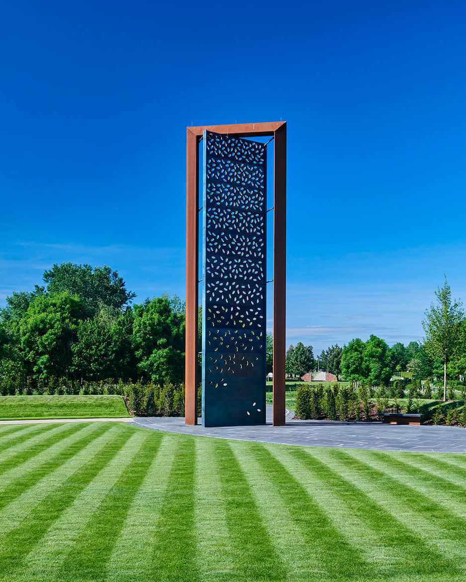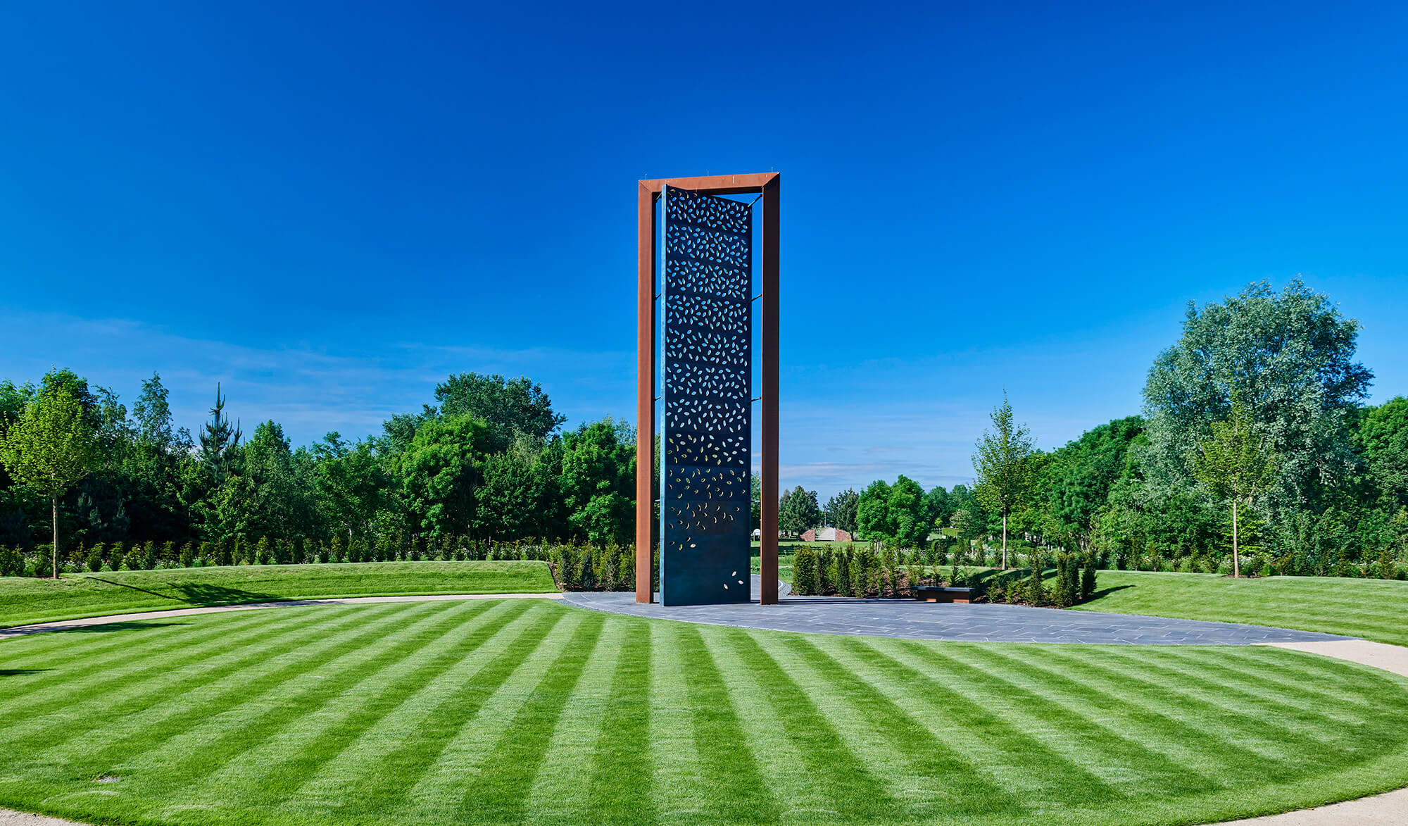 A wildflower meadow surrounds a pathway edged with descriptive text, and the distinctive Sillitoe Tartan - symbolic of policing - leads to the Memorial’s tall doorway supporting a brass screen. This represents the threshold to the dangerous places that officers go towards, from which some never return.