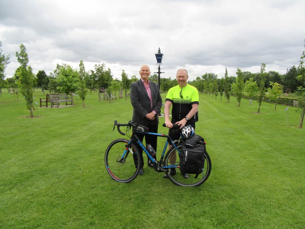 Paul, who is a Trustees of the Police Arboretum Memorial Trust, visited the National Memorial Arboretum on route – the site of the new UK Police Memorial – where he was by met fellow Trustee Sir Paul Scott-Lee who offered him support and words of encouragement.